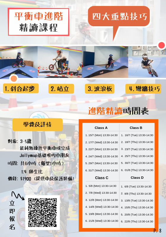當小朋友玩平衡車已熟練在平路滑行後,不少家長都希望子女更上一層樓學習新的平衡車技巧,讓玩的過程更有趣味。在平衡車上站立、上落波浪板、過彎牆和飛Jump(魚躍)更是近年流行的玩意。所以Jollymap推出暑期平衡車進階精讀班,特別涵蓋呢啲技巧。不但能提高玩平衡車的趣味,也在短時間內大大提升小朋友的能力和提升專注!
